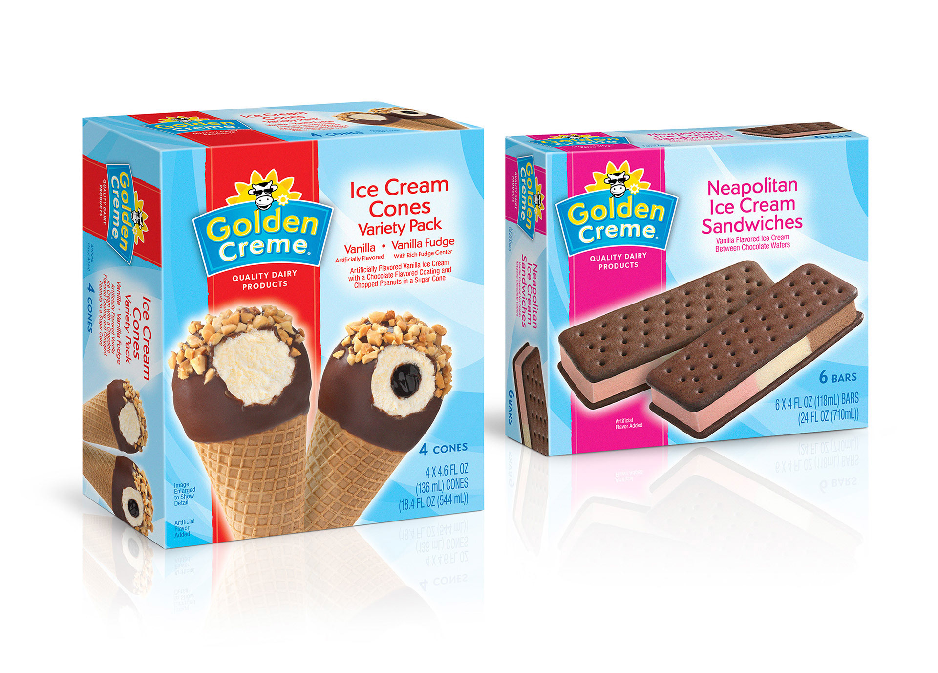 Staging a colored vertical banner on a dairy-blue background anchors the new logo and works with flavor names to communicate a rich and rewarding taste experience while differentiating between SKUs.