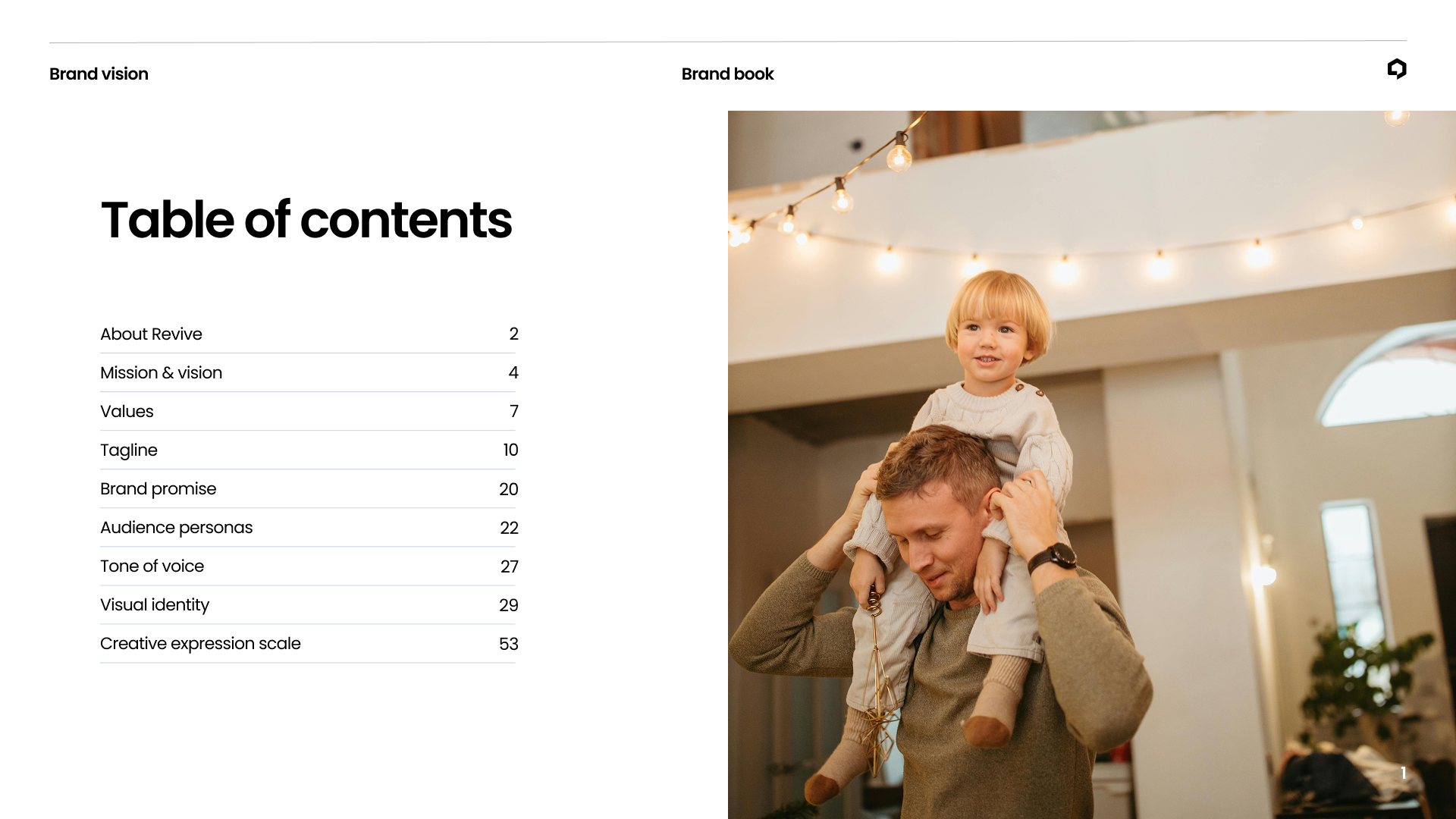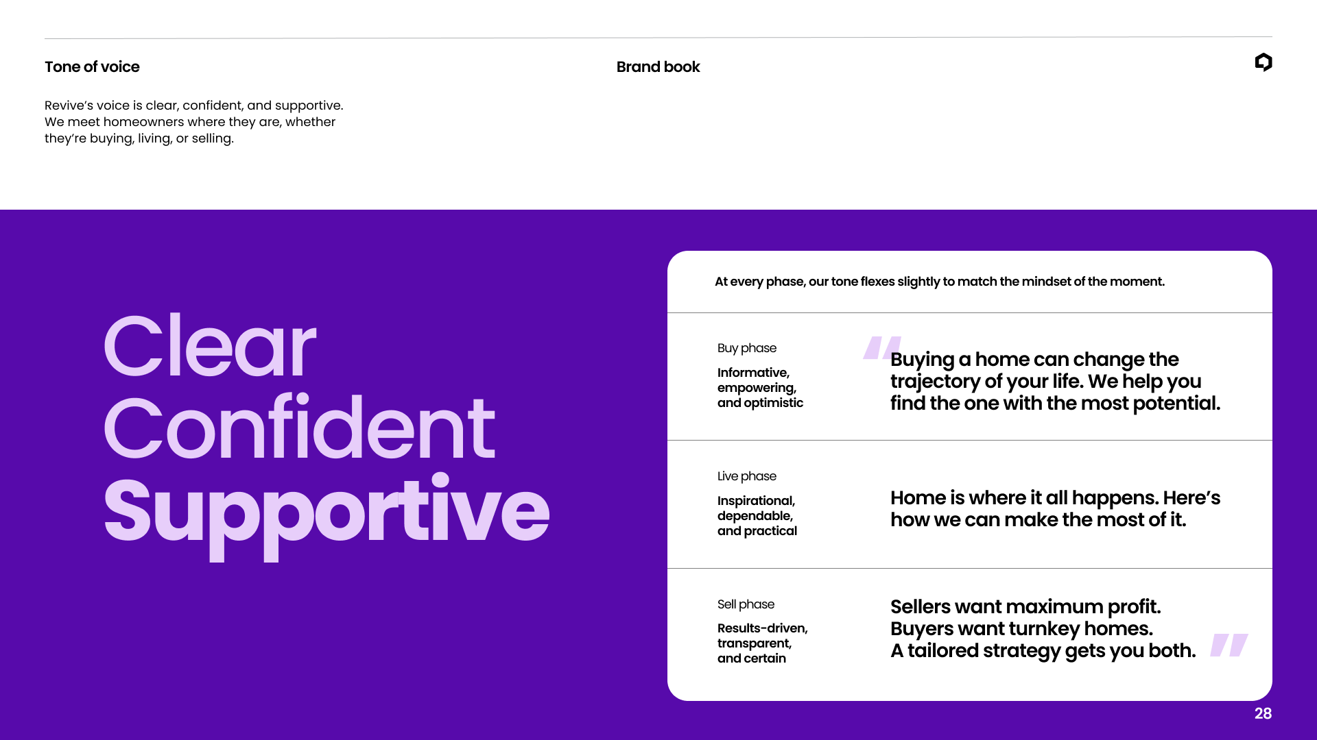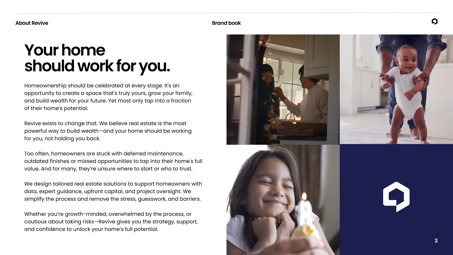 This was the kind of project that makes you feel really alive. As a team, we had deep conversations and guiding interviews with leadership to truly inform the vision and direction. Real care for the Revive brand and what it stands for guided every part of the creative research, development and strategy. This book is designed to tap into our customers' emotion, shift their mindset, and continue evolving as we build it together, bring it to life, and get to see real impact in the results.
